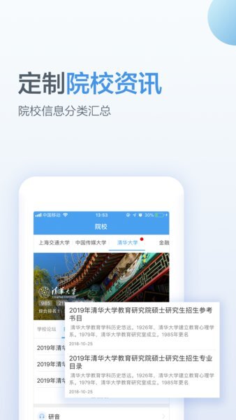 1、目标院校最新资讯、学长学姐经验分享、招生信息、报录分析。