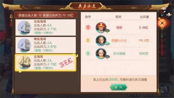 联盟海战是《叫我万岁爷》中的团队玩法之一,各位圣上加入联盟后即可参与联盟战,战场共有三个海域:北线,南线,主海,各位圣上可以在任一海域派兵进驻,当然各位圣上还可以调配自己的兵力到别的海域。如果失败将损失全部兵力,如果想要自己的联盟繁荣昌盛,加入联盟战是必不可少的!