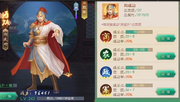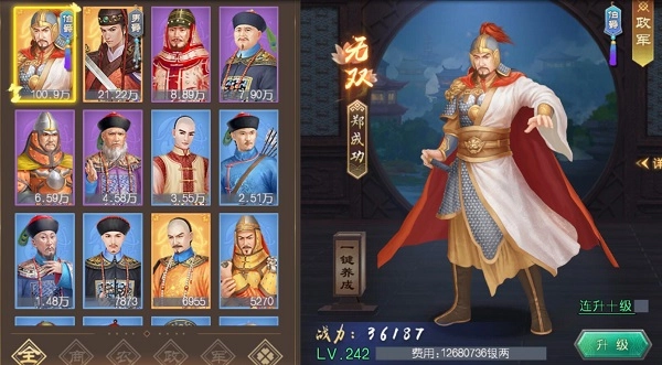 军事升级的核心作用在于提升对关卡的贡献值。这里建议在游戏前期优先培养商业大臣与军事大臣——商业属性提升后,征收时能获得更多银两;军事属性增强则有助于提高关卡的战斗力。前期应尽快参与关卡战斗来获取君王经验,君王等级每提升一级就会开启一次科举选拔,圣上们可挑选心仪的大臣册封为状元。而大臣升级是快速提升国力最基础的途径。