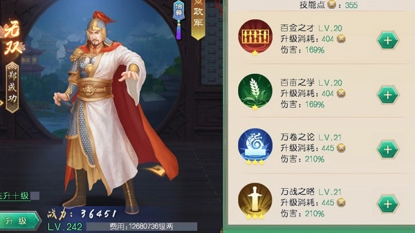 技能点也可以在校场中获取或者使用技能点包,使用后获得的技能点可以升级技能等级。平衡属性的大臣可以根据圣上们的自己的喜好选择升级建议优先升级名臣星级较高的属性,因为星级高的缘故初始的技能伤害也就高于其它3项。