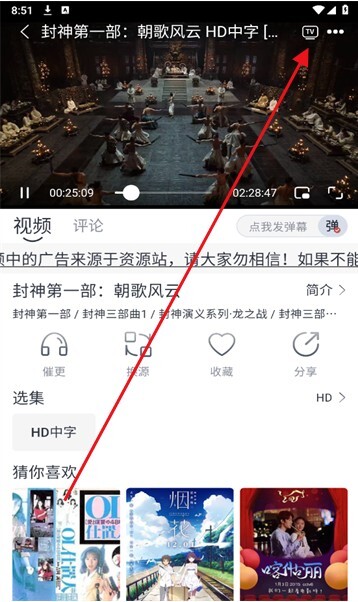 点开播放页面点击右上角播放TV图标就可以投屏。