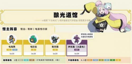 3、电系道馆:24级酿光市电馆主奇树,携带四只宝可梦,其中大将是24级的梦妖魔,太晶化变为电属性后难度会提升!建议捕捉一只地面系的乌波,等它进化后就能轻松克制奇树的队伍了。