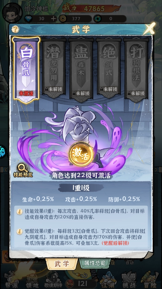 7、达到22级可以激活武学,提升战斗能力。
