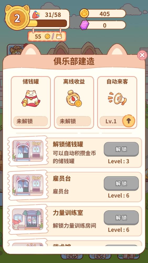 猫咪健身房(Kitty Gym)是一款以猫咪为主题的经营类游戏,玩家将化身为一只萌趣的猫咪,在小镇上开启一家全新的健身房。游戏中需要持续盈利来对健身房进行装修与升级,初始从基础的跑步训练房起步,添置跑步机、椭圆仪等有氧器械,以此积累第一桶金。当资金充足后,就能解锁武术房、力量房、舞蹈房等更多特色功能区域。