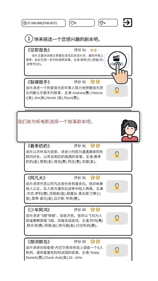 在拍摄的过程中,身为导演的你需要为新电影选择一个故事剧情,如图: