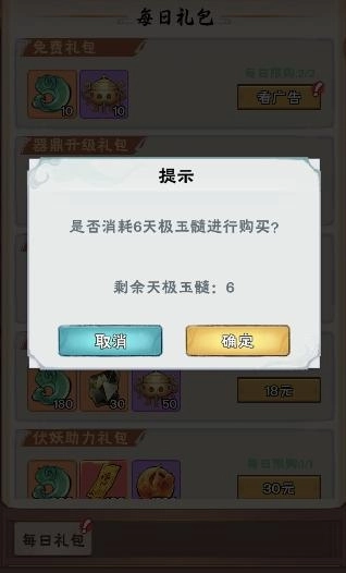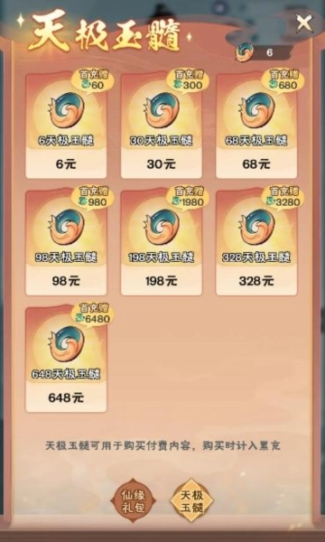 例如购买6元礼包,只需花费6个天极玉髓。