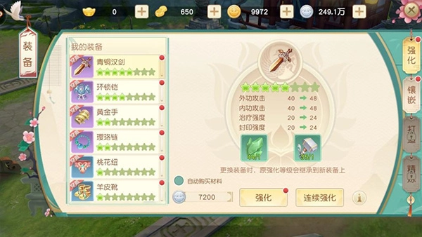 玩家可在游戏界面右下角点击装备按钮,对装备进行单次强化或连续强化操作,所需消耗的材料是低级玄铁与铁锤;装备的星等越高,强化时消耗的材料数量就越多,同时装备带来的属性加成也会相应提升,玩家能获得的战斗力也就越强。