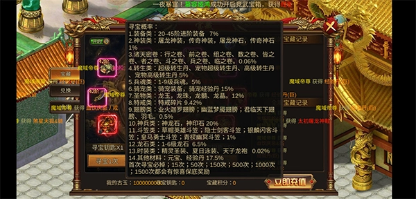 宝藏玩法的规则是:通过古玉购买宝藏积分时会获赠寻宝钥匙,使用钥匙即可参与寻宝。每次寻宝活动都有时间限制,所以若有需求建议及时参与,以免犹豫之际活动就已结束。
