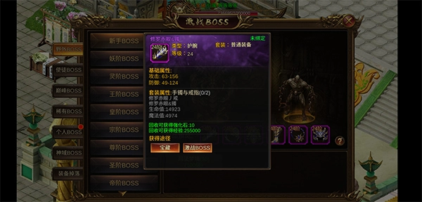 游戏中的boss类型丰富多样,主要分为野外boss、使徒boss、巅峰boss、稀有boss、个人boss和神域boss这几类。每一种boss都对应着不同的等级要求,玩家只有达到相应等级,才能去挑战击杀它们。在boss的展示图下方,会清晰地列出本次挑战可能掉落的神装,这一设计让玩家能提前了解奖励,十分便捷。