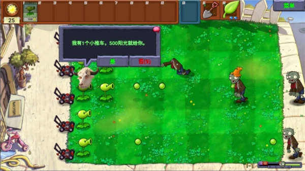 ①开局还是老样子,先跟玩家说“我给你拿个好东西”,接着牛头暂时离开片刻。过会儿他回来告知玩家“好东西马上就到,我先去趟厕所”,之后玩家会发现五路每条路上都出现了一只巨人僵尸。以玩家前期的实力,肯定是抵挡不住的,眼看五个巨人都快要碰到小推车时,牛头立刻回来道歉:“不好意思啊,刚才尿急拿错了,我这就弥补。”说完便移走了所有巨人。就在玩家刚松一口气的瞬间,牛头又折返回来,说道:“这回拿对了!”随即把一只普通僵尸放到了随机的小推车上。
