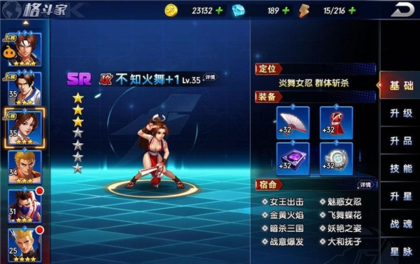 3、除了搭配的选择,此前我们也提及,格斗家配置采用2×3的格子布局,以上面图示的配置为例:八神与K是核心输出点,娜可露露承担收割职责,草稚京的伤害减免效果能有效保障八神的生存,再加上八神自身附带的吸血能力,使其可以持续稳定地输出;而拥有极限格挡与不死之躯称号的拉尔夫,尽管输出能力不突出,但凭借极厚的血量在前排站位,能够为后排角色减轻压力。
