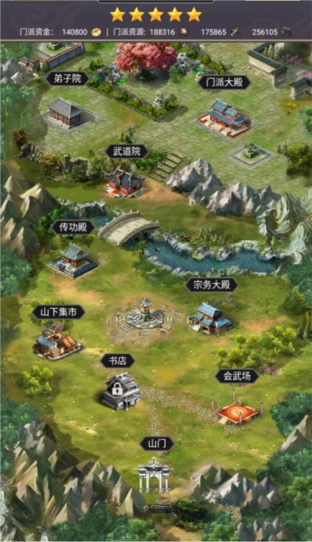 然后就是门派升级,门派升级》阵法升级》任务大殿》弟子宿舍》传功》功法》前期那个集市就不要搞,浪费我几十万材料,没点啥用,任务大殿最好是先搞到4级,可以做3个任务。