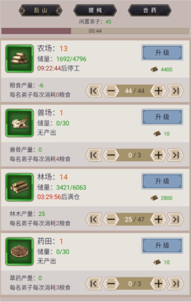 当初还没举行大典的时候,这些按钮我都能操作,不过有没有闲置弟子我记不清了,要是有的话你可以提前试试。看其他攻略说主要升级林场和农场,当时这点让我琢磨了好半天,结果愣是一点产出都没有,还是自己不够细心啊。得先产出粮食,才能制造木头(木头和集市买的材料不是一回事)。制造粮食不需要消耗什么,但制造木头的话,一个人得消耗2点粮食。所以刚开始可以安排3个人生产粮食,1个人制造木头,这样粮食能持续增加,木头也能正常产出。要是粮食没了或者生产停了,那就一点产出都没有了。我不知道这些能不能帮到你,但这确实是我之前踩过的小坑。