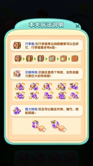 交换相邻两颗糖果的位置,若能让5个同色糖果在同一行或同一列连成一线,就会在交换的位置产生特殊效果。要是再次对这个特殊效果进行消除操作,就能清除掉所有与激活糖果颜色一致的糖果。