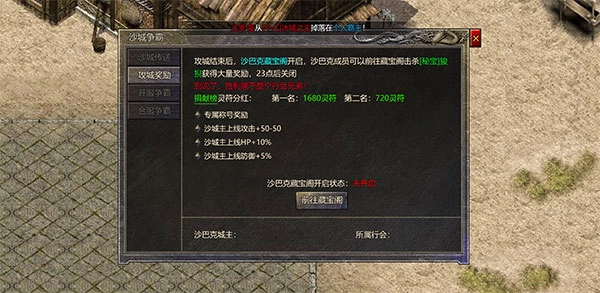 5、攻城结束后,沙巴克藏宝阁开启,行会成员可以前往藏宝阁击杀秘宝狻猊来获得大量奖励。