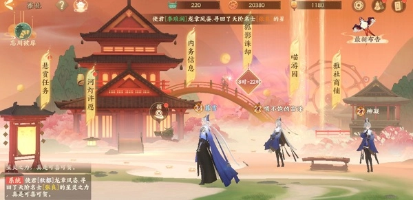 没错,那就是雅社,是聚集了大量优秀使君的地方,使君们点击屏幕下方的雅社按键,并选择加入一家雅社,然后就可以进入雅社内部查看了。只见雅社中有悬赏任务、河灯许愿、捐款、内务信息、狐影诛却、喵游园、雅社商铺七个功能。