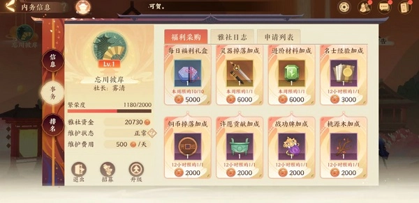 关于事务板块,使君可使用齐心玉兑换福利采购中的各类商品,包括每日福利礼盒、灵器掉落加成、进阶材料加成等。此外,使君能通过雅社日志了解雅社近期动态,申请列表则可查看申请加入本雅社的使君信息。最后在排名板块,可将本雅社所有成员按等级、繁荣度、名士拥有数量进行排序,感兴趣的使君不妨前往查看。