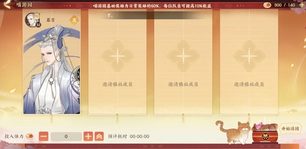 喵游园是一个佛系系统,和委派名士有点类似,只需要投入一定体力值,将猫灵寄养在此并让其开始游园,等到游园结束,就能获得猫咪带回来的奖励收益。同时,使君还可以带着同一雅社的成员一同开启游园。