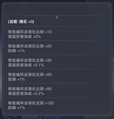 同时,魂环本身也能进行一定的强化,强化后的魂环将会提升一定的伤害、防御力,值得一提的是,当魂师佩戴的魂环总强化达到一定层数时,将会提升一定的【高级伤害】、【防御】