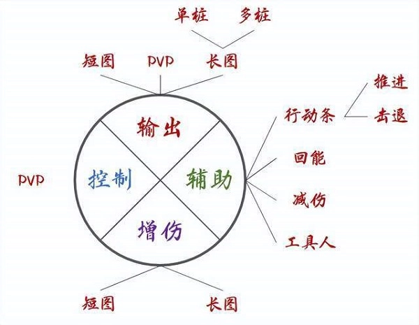 这里维一针对四大部分做了些细节上的延伸,简单解释一下:输出部分可细分为短图、PVP和长图,长图里还能再分成单桩敌人和多桩敌人的情况;辅助部分能拆成行动条、回能、减伤和工具人四个分支,行动条又能进一步分为推条和拉条两种;增伤部分可以划分为短图增伤与长图增伤两部分;最后的控制部分则主要集中在PVP类战斗中。在清楚了这些更细致的分类后,我们就能把不同的魂师对应进去,接下来维一就会给大家分别展示以上四大部分的魂师标签汇总,当然也会依次做一些补充说明。