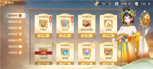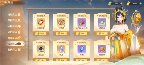 通用商店里的所有商品都得用金券购买,前期我只建议买少量招募令。抽卡上头是大家常有的毛病,稍微买一点问题不大,至少能抽得尽兴。凌云晶是角色晋升到绝世品质所需的进阶材料,目前暂时用不到;三昧赤金则是装备锻造到彩色品质时需要的进阶材料,这两样虽说都挺紧缺,但可以通过参与活动来获得稳定的获取渠道。昊武晶和名侠谱也是类似的情况,前期不建议购买,后期可以根据自己的紧缺程度和金券剩余情况再考虑是否入手。