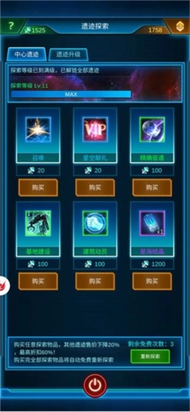 五、星海奇观每日有5次免费刷新机会。奇观内包含中心遗迹与黑洞遗迹两个部分:在中心遗迹中,你可以消耗模组来兑换对应的技能以及“星海结晶”道具,与此同时,这一操作还能推动黑洞遗迹的进度条增长;当进度条积累满额后,黑洞遗迹会自动解锁,此时你能免费获取一次相关奖励,之后若想抽取黑洞遗迹的技能,则需要通过付费方式随机获取(建议按需选择,避免不必要的花费)。 需要注意的是,黑洞遗迹开启后会在72小时内关闭。在其开启期间,即便继续消耗模组也无法再推进进度条,属于资源浪费。因此,策略上建议:当黑洞遗迹尚未开启时,你可以放心消耗模组以加快进度条推进;一旦遗迹开启,就应节省模组,避免不必要的消耗。
