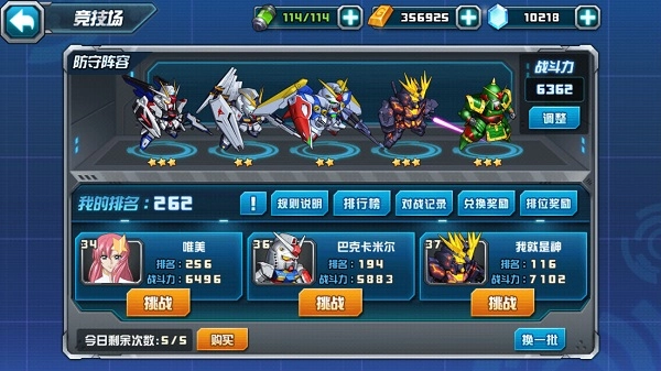 玩家能够自主设置和调整防守阵容,系统每次会推送3个对手供玩家挑选。点击对手头像就能查看其阵容,然后依据对方阵容来选择自己要上场的机体;要是觉得这3个对手都难以战胜,还可以点击“换一批”来更换对手,玩家可以借助这个功能提升胜率,从而获得更出色的排名!