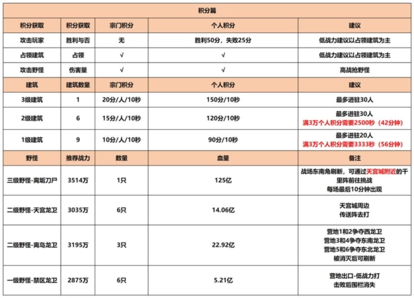 1. 开局策略:活动开局后的前10分钟,重点任务是抢夺野怪与争夺3级建筑,并围绕3级建筑展开攻防行动;对于综合实力相对较弱的宗门,可以适当放弃3级建筑的争夺,直接将目标转向2级建筑。