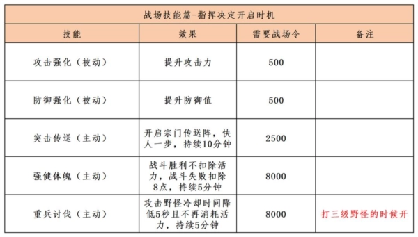 完成战场任务可获得侠义令,侠义令可以开启战场技能,帮助宗门建立优势。其中: