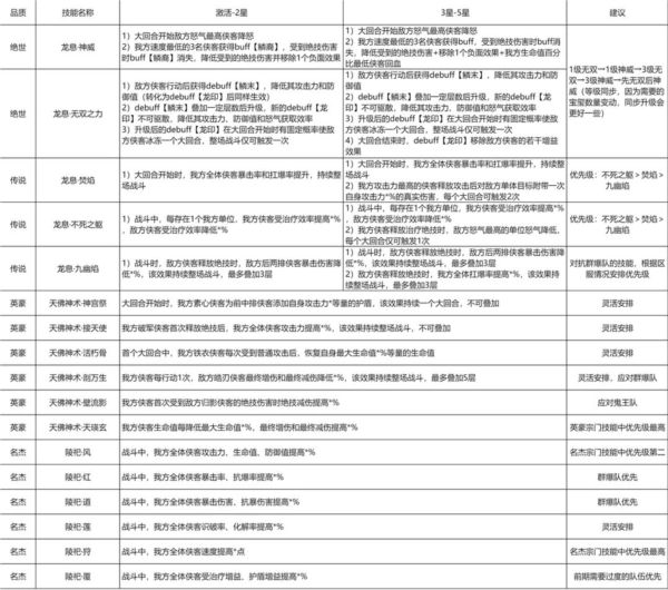 6)英豪技能优先级建议:天瑛玄第一,其他根据实际情况灵活抉择,详见下表