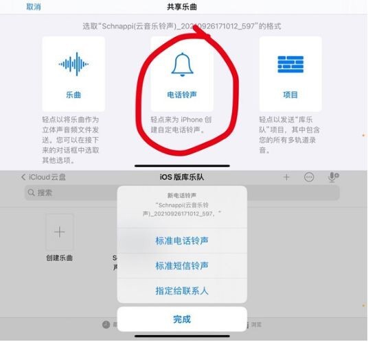 3、在库乐队中长按音乐,在跳出来的对话框中选择【共享】。