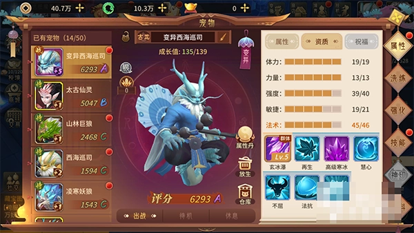 西海巡司虽是银级宠物,但能力颇为不俗。作为法术输出型宠物,其专属技能的群体伤害相当出色,且该技能能获得精神属性的加成,培养难度也较低。在技能选择方面,需优先保障生存能力并兼顾附加效果的提供,如此才能充分发挥它的优势。