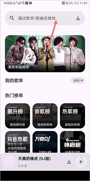 2、然后输入歌名或歌手名就可以搜索出自己的音乐,搜索出来后点击旁边的按钮