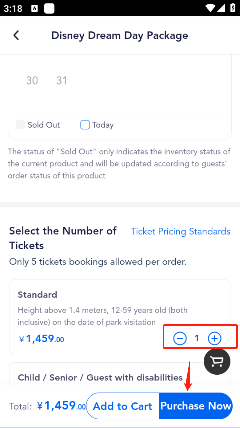 5、接着确定好时间日期,向下滑动页面添加购票数量,点击“Purchase Now”立即购买,完成支付后门票就预订成功了。