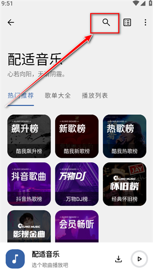 1、请在本站安装适配的音乐应用,安装完成后打开该应用,点击界面右上角的放大镜图标,即可进入搜索页面。
