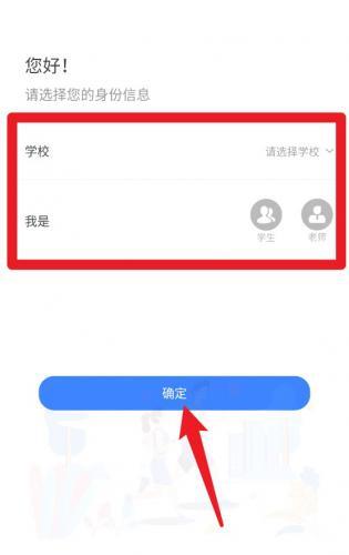 1、进入页面后请先选择所在学校及身份类型,然后点击页面下方蓝色“确定”按钮继续。