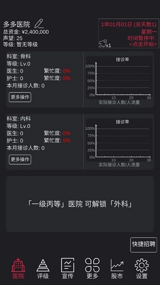 1、招募医生:医生按专业水平划分为初级、中级、高级三个等级。初级医生的诊疗效果欠佳,中级医生的治疗成效处于中等水平,高级医生则具备精湛的治疗能力。由此可见,吸纳高级医生对提高医院的治疗质量与经济效益起着关键作用。