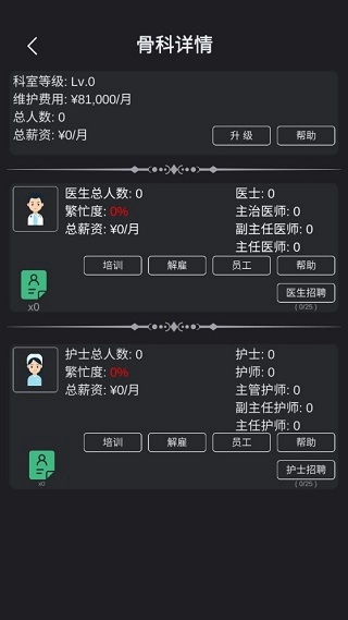 2、招募护士:护士按级别划分为初级、中级和高级三个等级。其中,初级护士的治疗效果欠佳,中级护士的治疗效果处于中等水平,而高级护士具备较高的治疗能力。所以,招募高级护士是提升医院治疗效果与收益的重要途径。