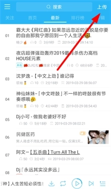 1、现在进入“dj音乐库”的主页后,大家要先点击右上角的上传按钮(如下所示),此时软件就会自动扫描手机本地存储的音频文件。