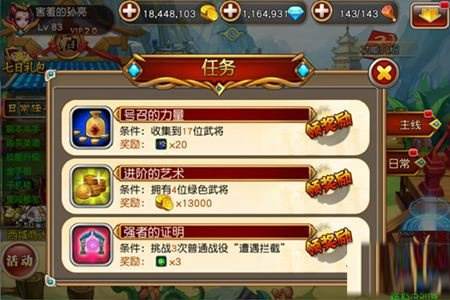 任务引领着我们的武将,从籍籍无名的小兵逐步踏上变强的征程。完成各类任务能获取相应的任务奖励,其中包含丰厚的钻石、金币以及稀有道具!