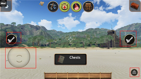 游戏采用第一人称视角,屏幕左右两侧的虚拟圆圈分别用于操控移动和视角,每个圆圈上方各设有两个动作指令按钮,这些按钮会依据不同指令切换,从而完成攻击、建造、采集等操作。