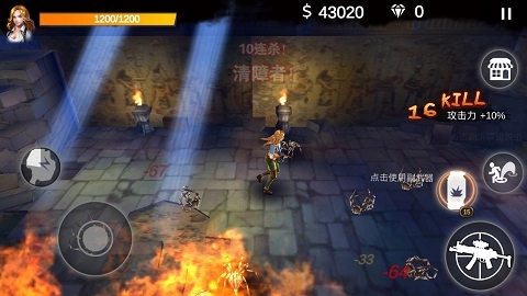 在游戏中操作方法比较简单,左侧的虚拟摇杆,可控制角色的移动,右侧则是道具的使用和攻击按钮,这里的武器子弹没有限制,但武器的升级强化却是有的,因此在商场中,可将武器强化更多等级,以此来面对数以百计的僵尸浪潮大军,同时玩家还要注意的一点就是,在这款游戏中,有一个短暂的位移技能,当被僵尸围追堵截难以脱身的情况下,可翻滚躲避围堵,并寻找合适地点,快速消灭。