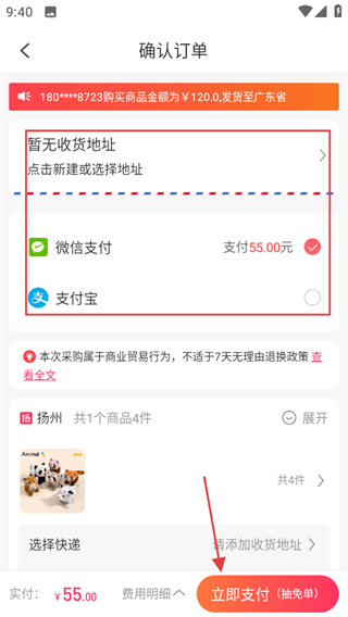 5、在订单页,填写收货地址并选择支付方式后点击立即支付可完成订购。