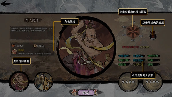 玩家开局可以选择使用的角色、和对应的先天资质,点击左下角角色头像可以刷新资质列表。