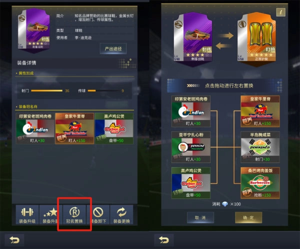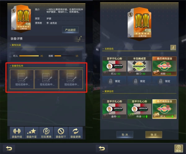 号码调整到位后,其他装备的升级也得跟上节奏!艾特足球新版本里,装备冠名系统已惊喜上线。点击装备就能找到冠名系统的入口,你可以花费一定的欧元和精华之证来刷新冠名,从中挑选契合你需求的选项。消耗的数量会随着刷新次数增多而增加,不过每天都会重置回初始消耗状态。