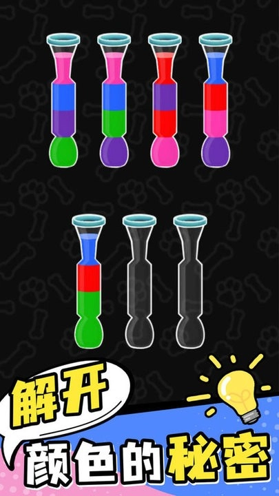 玩家需操作盛有彩色液体的试管,把颜色相同的液体倒入同一个容器中。