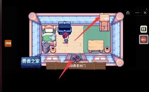 1、点击左上角的勇者之家,利用牌匾掉落砸醒勇者,这样勇士可以起床就通关了