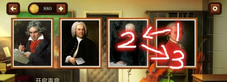 开启声音,根据听到的歌曲,点击对应的人物。完成后,开门过关。