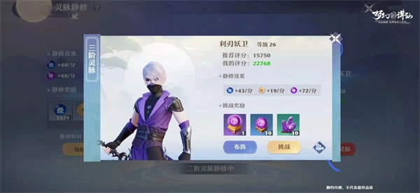 5、灵脉挑战(单人活动23级开启)不断挑战灵脉,提升静修收益,挑战成功可获得经验、玄晶、仙丹等珍稀道具,难度较高,需指定策略谨慎挑战。