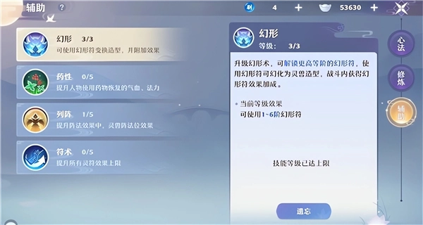道友完成主线剧情任务可获得剧情点奖励,在【技能 - 辅助】界面即可学习幻形术。